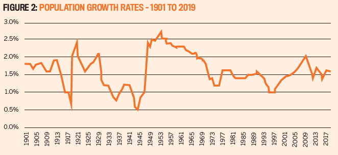 This demand could be for rentals or owner-occupation, for units or houses, but as long as our population grows, we need more dwellings. Figure 2 shows the annual population growth rates of our capital cities since we became a nation in 1901.