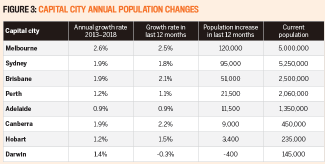 While our national population growth is currently 1.6% per year, the growth rates of our three biggest cities – Sydney, Melbourne and Brisbane – are much higher, as Figure 3 shows.