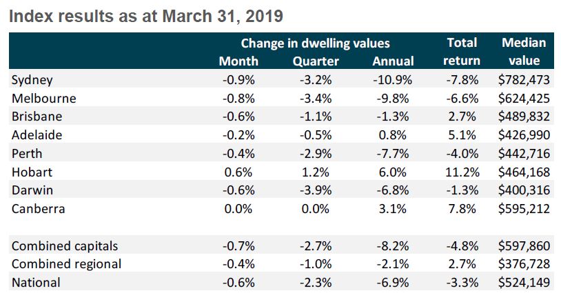 In March 2019, dwelling values were 0,6% lower across all capital cities the 0.6% which was actually the smallest of the month-on-month declines since October last year.