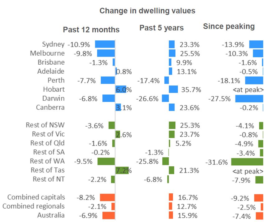 Over the past year, combined capital city dwelling values were 8.2% lower and combined regional market values were 2.1% lower.