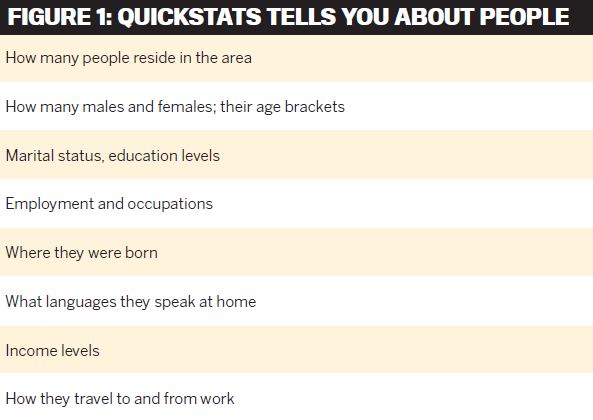 The easiest way to access census data is with QuickStats, which provides a snapshot about people, their occupations and income, family types, dwelling characteristics and types of tenure, such as the number of properties being rented, being purchased, or fully owned for any suburb, local government area or region. To find QuickStats on your computer, simply google ‘QuickStats ABS’.
