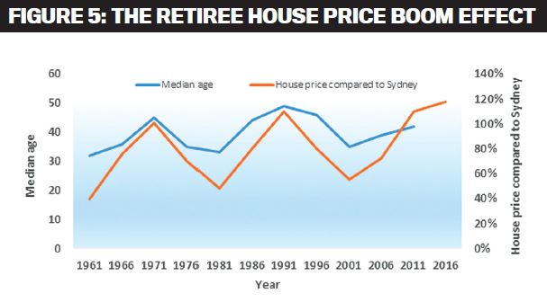 Most of the great retirement boom markets in northern NSW and Queensland, such as Byron Bay and the Gold Coast, were created by these retirees and ended when they stopped moving there. These retirement locations have a recurring pattern of housing price growth and decline that is closely tied to the life cycle of their retiree residents. It all begins when a new retirement area is ‘discovered’ by retirees and as it becomes popular the housing market booms as demand rises.