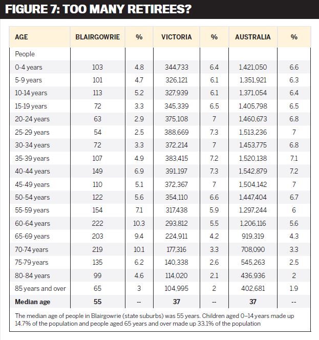 On the other hand, Figure 7 tells a completely different story, and shows us that the median age in Victoria’s Mornington Peninsula suburb of Blairgowrie is 55. This means half of the locals are aged 55 or more. The summary below the table also indicates that one third of the suburb’s population is aged 65 or over. This is an area to which retirees were attracted some years ago, but not any more.