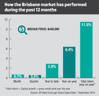 For example, in the latest RP Data CoreLogic Home Value Index results for September 2014, Brisbane was one of only three capital cities to record an increase (of 0.7%) in dwelling values over the month. It also posted a 0.6% increase over the quarter and a year-on-year increase of 6.4%.