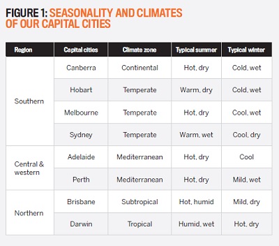 As Figure 1 shows, Australia’s capital cities are situated in a variety of climate zones, ranging from tropical to temperate, and in some northern cities winter is a far more agreeable time of year to conduct on-the-ground housing research, while summers can be uncomfortably humid.