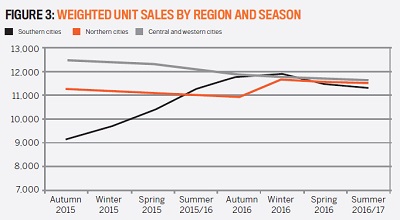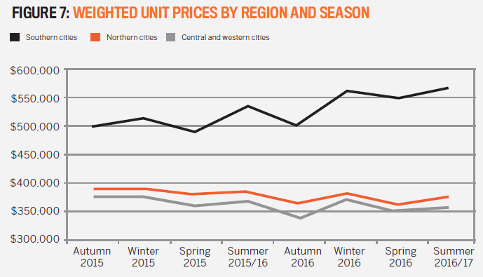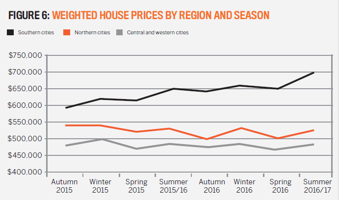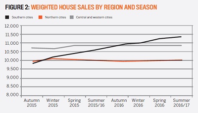 Naturally, cities in other housing markets can then be included in one of these three groups, according to their location. Figure 2 (overleaf) shows the house sales for each season and each group of cities from autumn 2015 to the 2016/17 summer.