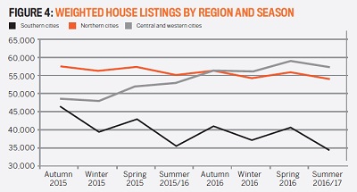With no overall seasonal change affecting sales, the balance of supply and demand can only be influenced by the supply side – or the number of listings. Figure 4 shows the average number of daily house listings that occurred during each season for each of the three housing market regions we have analysed.