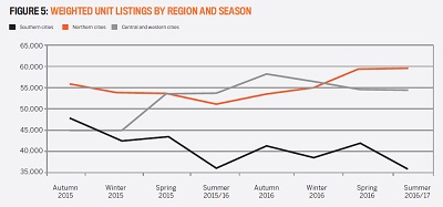 Figure 5 (overleaf) gives us the same data for units, showing that there is also a clear seasonal change in the number of units listed for sale in each region, with the listings being lowest in winter and in summer. These variations are more pronounced in the southern cities of Sydney and Melbourne but still don’t hide the overall downward trend in listings that has taken place.
