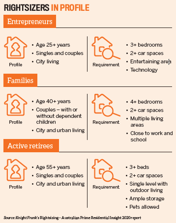 In essence, rightsizers are looking for luxury apartments with at least three bedrooms and two secure car spaces in medium- and high-density projects in prime suburbs in Australian cities.