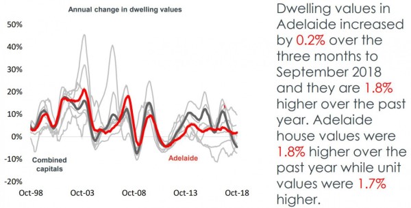 In Adelaide over the past few years there has been consistent moderate house price growth - house values were 1.8% higher over the year and apartments grew in value by 1.7%.