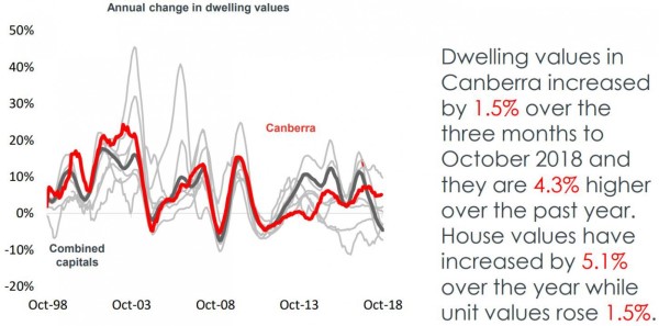 Canberra’s property market is a “quiet achiever” with dwelling values having grown 4.3% over the last year with house price growth (+5.1%) much stronger than the apartment market (+1.5%)