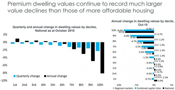 In the Melbourne’s property market, the top 25% of the market by value has seen values fall by almost 9% over the past year; while in Sydney’s the upper quartile of the market values were down by 8.6%.