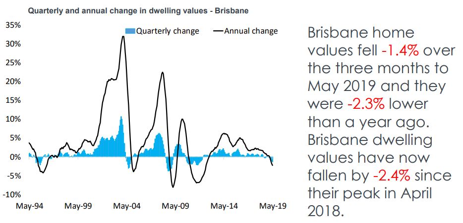 Brisbane property values were down 0.5% in May, with falls confined to the detached housing sector.