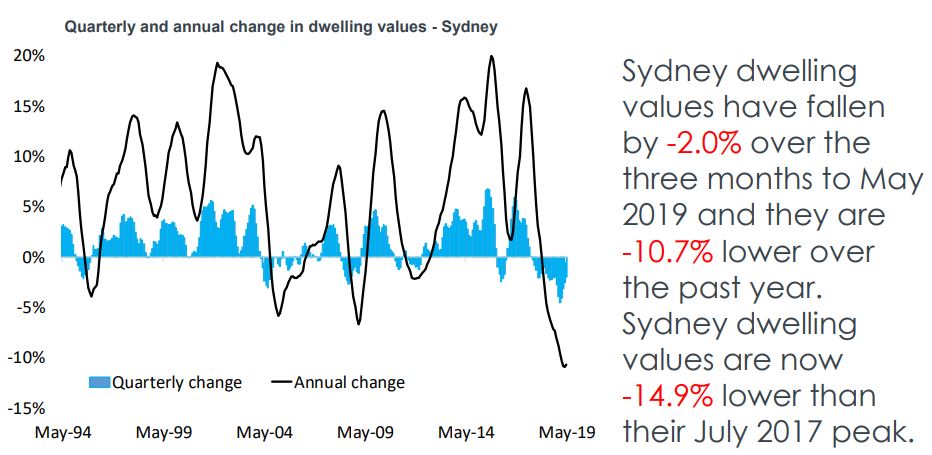 Sydney dwelling values continued to trend lower in May, down a further 0.5% over the month and are now down 14.9% from their market peak in July 2017.