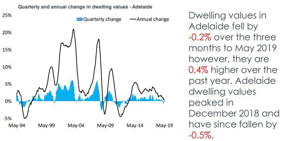Adelaide is the most affordable capital city in Australia with dwelling values falling -0.2% over the last 3 months but they are up 0.4% over the last year.