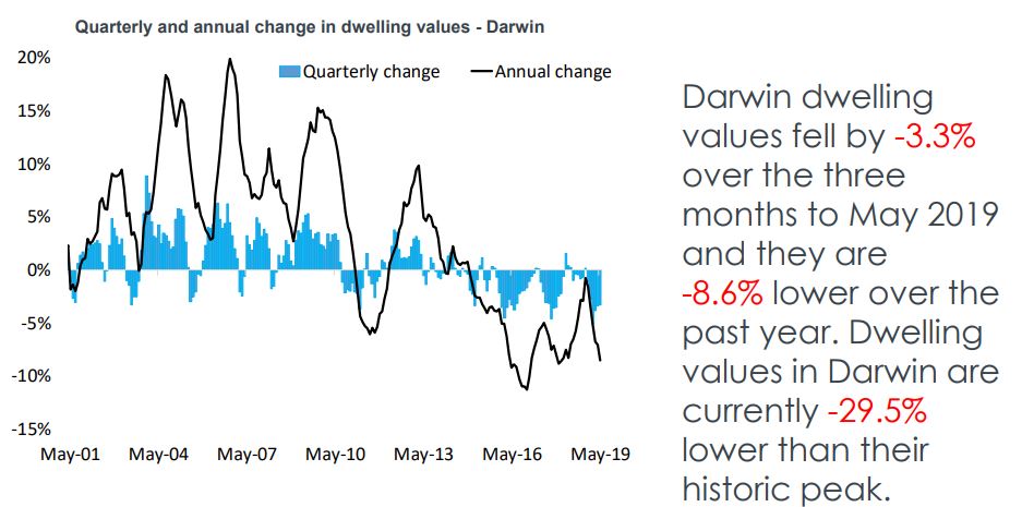 The Darwin property market peaked in August 2010 is still suffering from the effects of the end of our mining boom with a very soft employment market and lack of migration and infrastructure spending.