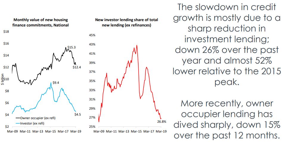 • Housing finance data and credit aggregates highlight the slowdown in investment lending, while owner occupier lending has slowed but has risen by 5.5% over the 12 months to April 2019 while investor credit has increased at an historically slow rate of 0.6%.