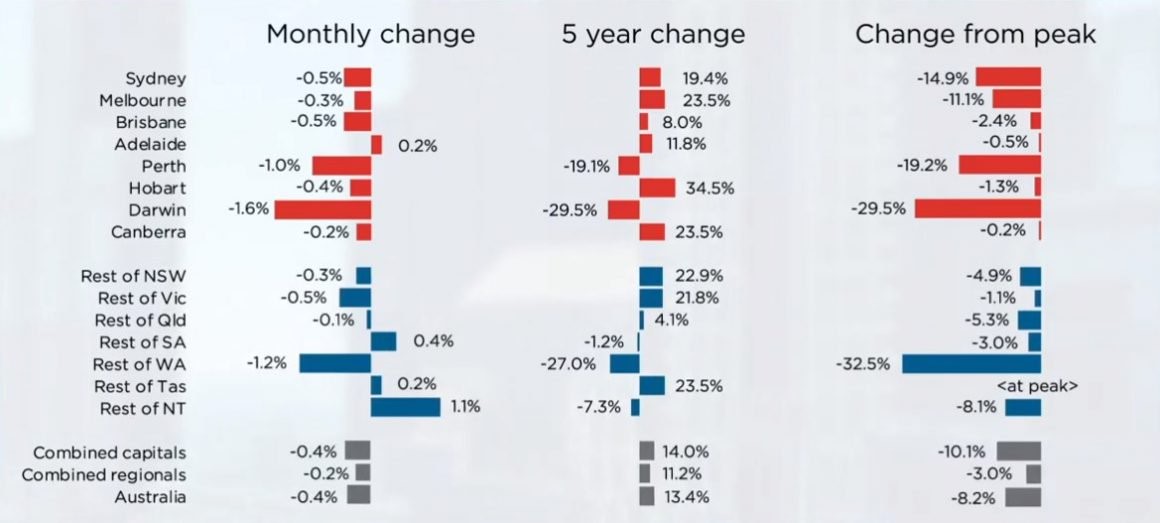 Combined capital city dwelling values were -8.4% lower over the year and combined regional market values were -3.0% lower.