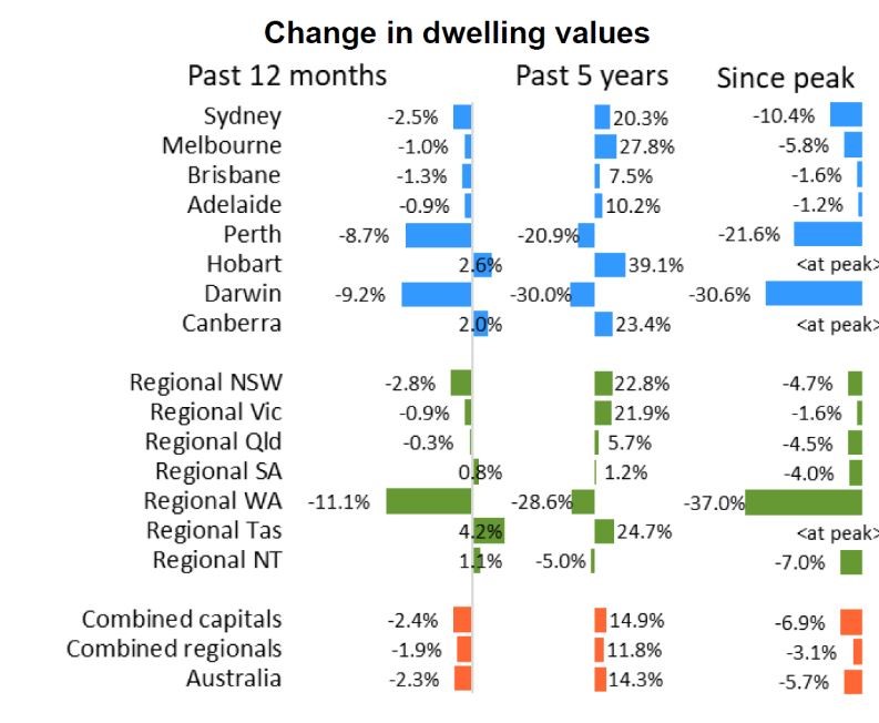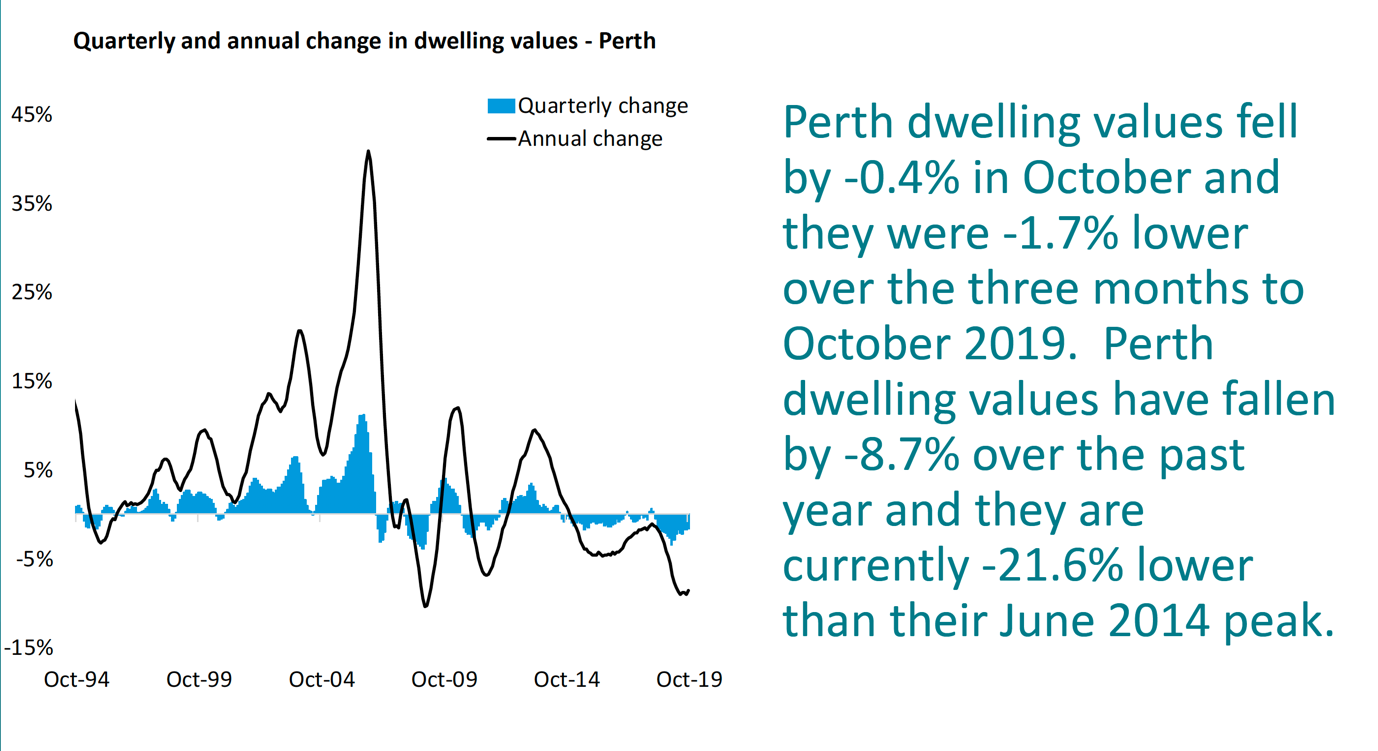 Perth has recorded a further reduction in dwelling values, down 0.4% over the last month and 8.7% lower over the past year, taking values 21.6% lower since peaking in June 2014.