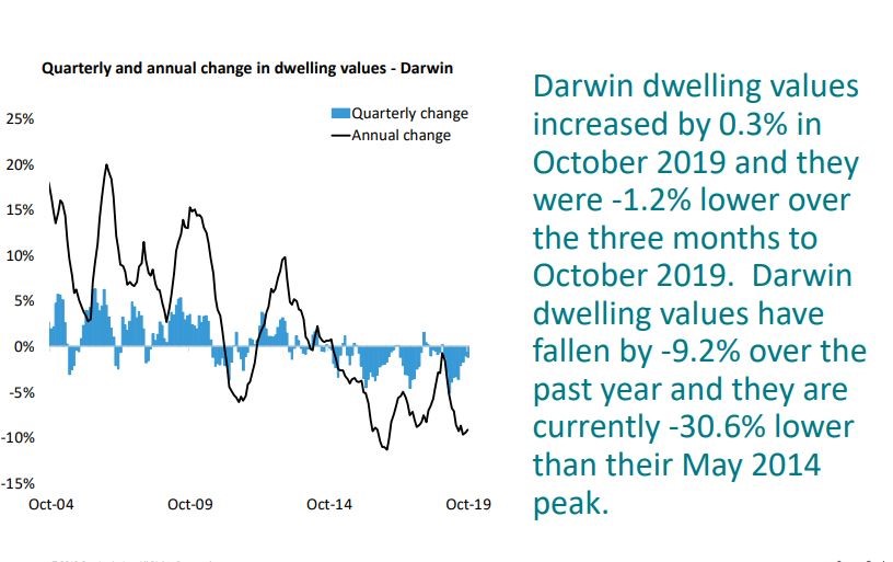 The Darwin property market peaked in August 2010 is still suffering from the effects of the end of our mining boom with a very soft employment market and lack of migration and infrastructure spending.
