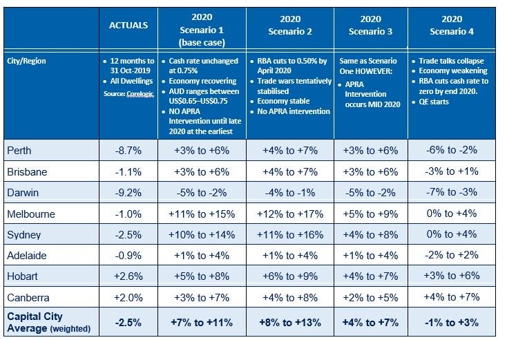 Well…even stronger price growth according to SQM Research’s annual Housing Boom and Bust Report which suggests that most of Australia’s capital cities will benefit from the interest rate cuts and loosening of credit restrictions to record dwelling price rises over 2020 with Sydney and Melbourne leading the charge.