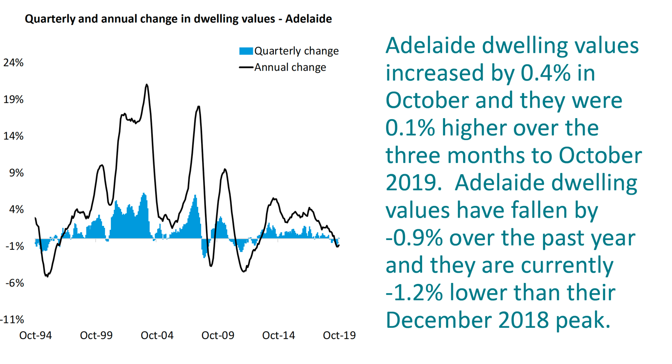 Adelaide housing values have been trended lower for much of this year, but recorded a 0.4% rise in October.