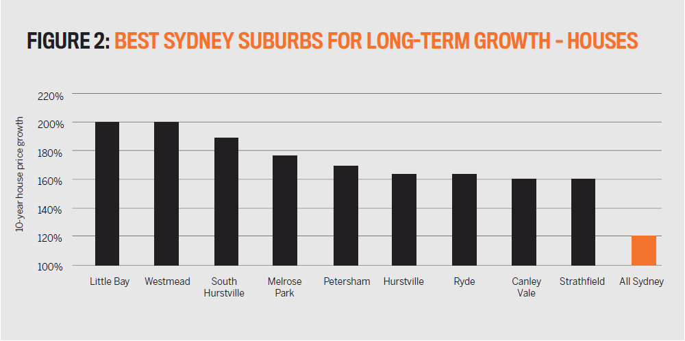 Figure 2 shows the Sydney suburbs that have enjoyed the highest long-term growth in house prices over the last 10 years, compared to Sydney’s median house price growth over the same period.