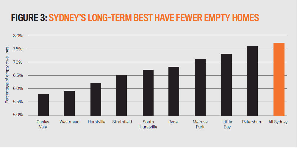 Now look at Figure 3 and you will see that these same suburbs have much lower unoccupancy rates than Sydney as whole.
