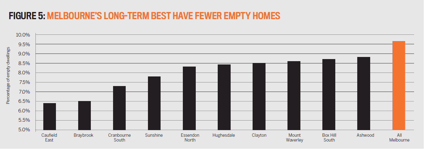 Now look at Figure 5(overleaf), which shows you the unoccupancy rates of Melbourne’s best long-term house price performers compared to Melbourne as a whole. Not only are they all lower than Melbourne, but the best performer, Caulfield East, also has the lowest unoccupancy rate.