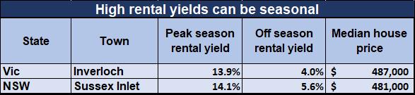 Good yield is driven by rent demand, not by price falls, so look for high rental yield in areas with high rental demand, such as tourist destinations, tertiary education precincts, infrastructure construction zones and locations favoured by overseas arrivals. All of these households create genuine rent demand. Some of the highest good yields can be found in coastal suburbs where prices have risen in recent years, such as those shown in the table below, but these are seasonal holiday locations, and the high yield is only obtained during the peak summer season. Watch out for such seasonal variation traps.