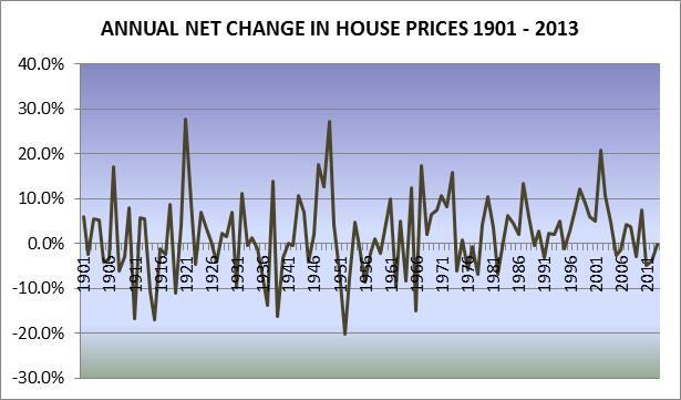 This is not ‘real’ growth because it includes the underlying inflation rate. Our inflation rate has averaged 3.8% annually since 1901 , and when this is deducted from the growth rate, it leaves housing growing at an average of just 2% per year. However, since the end of World War II the average annual inflation rate has been higher at 5.2%, and when we deduct this from the annual average housing growth rate of 8.2%, we are left with a real growth rate averaging 3% per year. The studies show that the main cause of house price growth has always been inflation and that the rate of house price changes has also closely followed the inflation rate.